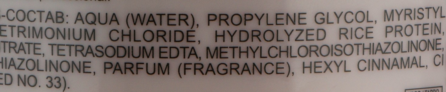 Состав: Aqua (Water), Propylene Glycol, Myristyl Alcohol, Cetrimonium Chloride, Hydrolyzed Rice Protein, Magnesium Nitrate, Tetrasodium EDTA, Methylchloroisothiazolinone, Methylisothiazolinone, Parfum (Fragrance), Hexyl Cinnamal, CI 17200 (D&C Red No. 33)