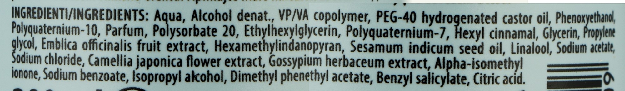 Состав: Aqua, Alcohol denat., VP/VA copolymer, PEG-40 hydrogenated castor oil, Phenoxyethanol, Polyquaternium-10, Parfum, Polysorbate 20, Ethylhexylglycerin, Polyquaternium-7, Hexyl cinnamal, Glycerin, Propylene glycol, Emblica officinalis fruit extract, Hexamethylindanopyran, Sesamum indicum seed oil, Linalool, Sodium acetate, Sodium chloride, Camellia sinensis leaf extract, Gossypium herbaceum extract, Alpha-isomethyl ionone, Isopropyl alcohol, Sodium benzoate, Dimethyl phenethyl acetate, Benzyl salicylate, Citric acid
