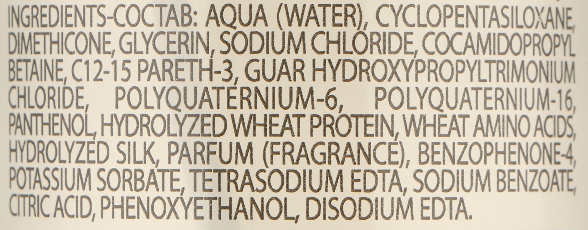 Состав: Aqua (Water), Cyclopentasiloxane, Dimethicone, Glycerin, Sodium Chloride, Cocamidopropyl Betaine, C12-15 Pareth-3, Guar Hydroxypropyltrimonium Chloride, Polyquaternium-6, Polyquaternium-16, Panthenol, Hydrolyzed Wheat Protein, Wheat Amino Acids, Hydrolyzed Silk, Parfum (Fragrance), Benzophenone-4, Potassium Sorbate, Tetrasodium EDTA, Sodium Benzoate, Citric Acid, Phenoxyethanol, Disodium EDTA