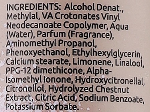 Alcohol Denat., Methylal, VA Crotonates Vinyl Neodecanoate Copolymer, Aqua, Parfum, Aminomethyl Propanol, Phenoxyethanol, Ethylhexylglycerin, Calcium stearate, Limonene, Linalool, PPG-12 dimethicone, Alpha-Isomethyl lonone, Hydroxycitronellal, Citronellol, Hydrolyzed Chestnut extract, Citric acid, Sodium Benzoate, Potassium Sorbate.