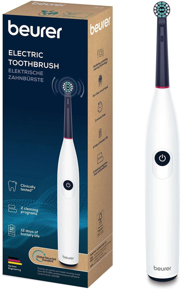 Утро с улыбкой и приятными ощущениями во время чистки каждый день. Beurer TB 15 Green Planet – эффективная и удобная щетка с проверенной осциллирующе-пульсирующей технологией для тщательного ухода с немецким качеством. Насадки щетки универсальны: подходят для большинства электрощеток (Oral-B, PHILIPS) с круглой головкой*. Осциллировочно-пульсирующая технология эффективно удаляет налет в труднодоступных местах и вдоль линии десен, обеспечивая ощутимую чистоту. Клинически доказано: щетка эффективно устраняет налет и поддерживает здоровье десен. Два режима помогут выбрать ежедневную очистку или деликатный уход для чувствительных зубов. Встроенный таймер на 2 минуты с интервалами каждые 30 секунд способствует равномерной очистке всех зон. Аккумулятора хватает до 12 дней автономной работы, после завершения цикла щетка автоматически выключается. В комплекте – экологическая насадка Clean Eco Blau из 100% эко материалов. Корпус изготовлен на 60% из экоматериалов.