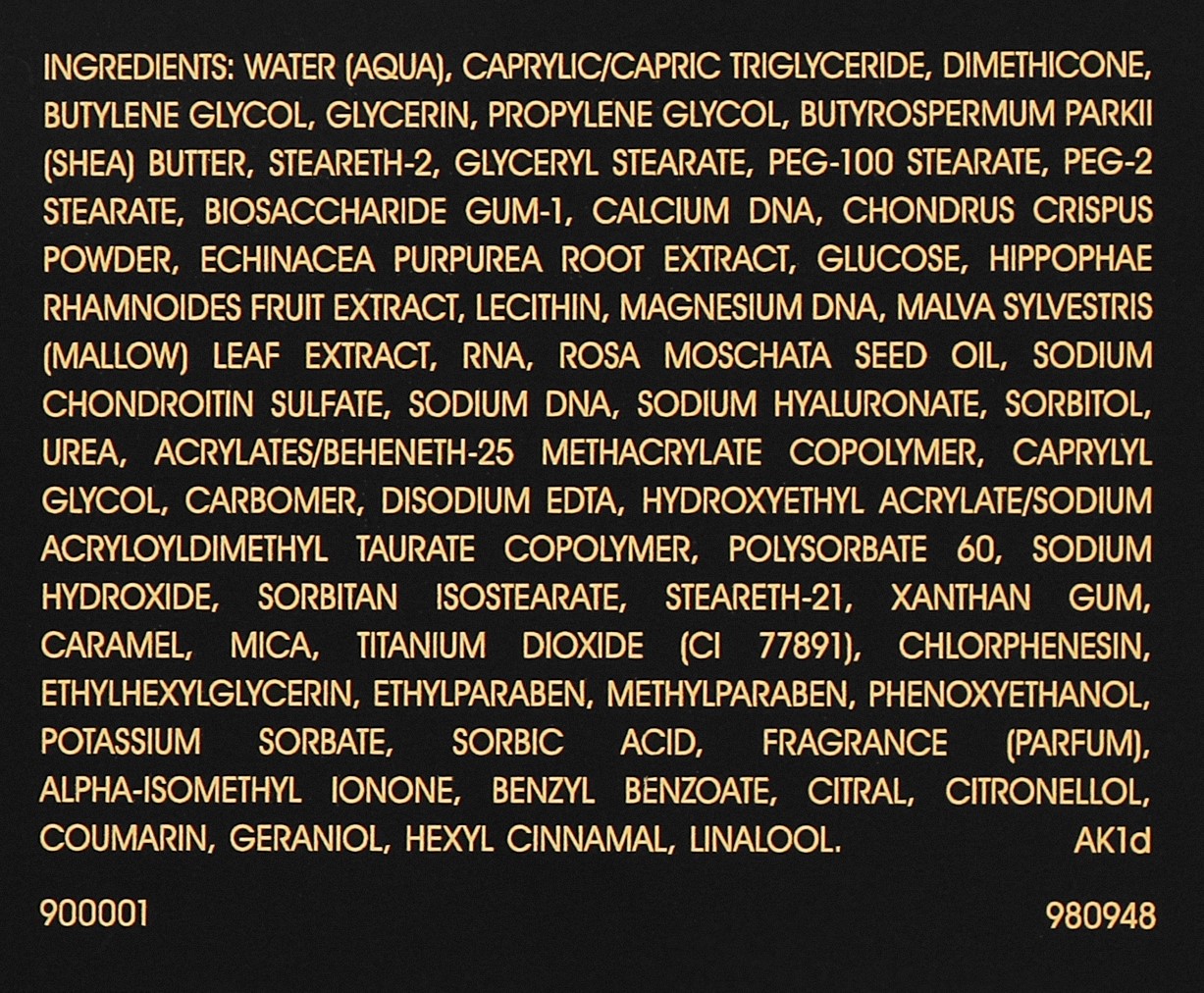 Состав: Water (Aqua), Caprylic/Capric Triglyceride, Dimethicone, Butylene Glycol, Glycerin, Propylene Glycol, Butyrospermum Parkii (Shea) Butter, Steareth-2, Glyceryl Stearate, Peg-100 Stearate, Peg-2 Stearate, Biosaccharide Gum-1, Calcium Dna, Chondrus Crispus Powder, Echinacea Purpurea Root Extract, Glucose, Hippophae Rhamnoides Fruit Extract, Lecithin, Magnesium Dna, Malva Sylvestris (Mallow) Leaf Extract, Rna, Rosa Moschata Seed Oil, Sodium Chondroitin Sulfate, Sodium Dna, Sodium Hyaluronate, Sorbitol, Urea, Acrylates/Beheneth-25 Methacrylate Copolymer, Caprylyl Glycol, Carbomer, Disodium Edta, Hydroxyethyl Acrylate/Sodium Acryloyldimethyl Taurate Copolymer, Polysorbate 60, Sodium Hydroxide, Sorbitan Isostearate, Steareth-21, Xanthan Gum, Caramel, Mica, Titanium Dioxide (Ci 77891), Chlorphenesin, Ethylhexylglycerin, Ethylparaben, Methylparaben, Phenoxyethanol, Potassium Sorbate, Sorbic Acid, Fragrance (Parfum), Alpha-Isomethyl Ionone, Benzyl Benzoate, Citral, Citronellol, Coumarin, Geraniol, Hexyl Cinnamal, Linalool.