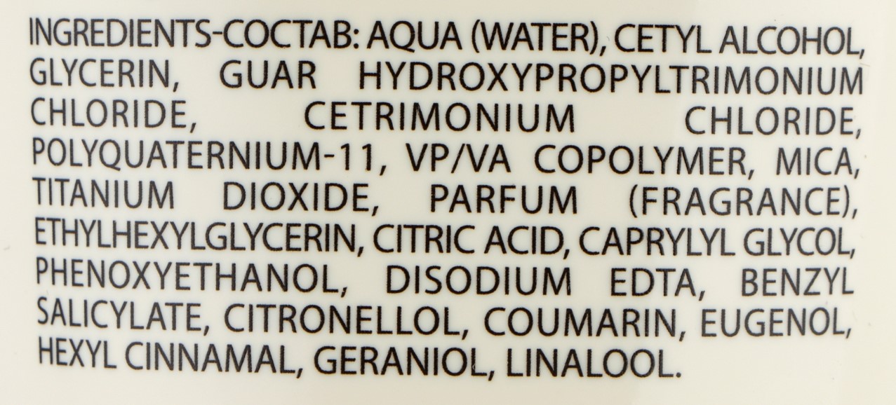 Состав: Aqua (Water), Cetyl Alcohol, Glycerin, Guar Hydroxypropyltrimonium Chloride, Cetrimonium Chloride, Polyquaternium-11, VP/VA Copolymer, Mica, Titanium Dioxide, Parfum (Fragrance), Ethylhexylglycerin, Citric Acid, Caprylyl Glycol, Phenoxyethanol, Disodium EDTA, Benzyl Salicylate, Citronellol, Coumarin, Eugenol, Hexyl Cinnamal, Geraniol, Linalool