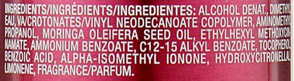 Состав: Alcohol Denat., Hydrofluorocarbon 152a, Water/Aqua/Eau, Butane, VA/Crotonates/Vinyl Neodecanoate Copolymer, Aminomethyl Propanol, Moringa Oleifera Seed Oil, Ethylhexyl Methoxycinnamate, Ammonium Benzoate, C12-15 Alkyl Benzoate, Tocopherol, Benzoic Acid, Alpha-Isomethyl Ionone, Hydroxycitronellal, Limonene, Fragrance/Parfum.