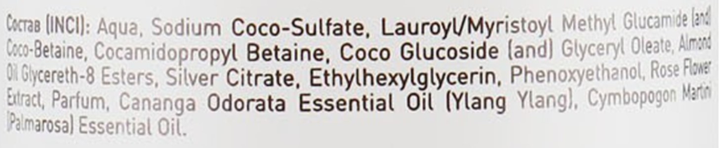Состав: Aqua (Water), Sodium Cocoyl Isethionate, Cocamidopropyl Betaine, Coco-Glucoside, Glycerin, Disodium Laureth Sulfosuccinate, Silver Citrate, Inulin, Alpha-Glucan Oligosaccharide, Aloe Barbadensis Leaf Extract, Chamomilla Recutita (Matricaria) Flower Extract, Bidens Tripartita Flower/Leaf/Stem Extract, Propylene Glycol, PEG/PPG-120/10 Trimethylolpropane Trioleate, Laureth-2, Sodium Chloride, Sodium Benzoate, Potassium Sorbate, Parfum (Fragrance), Citric Acid.