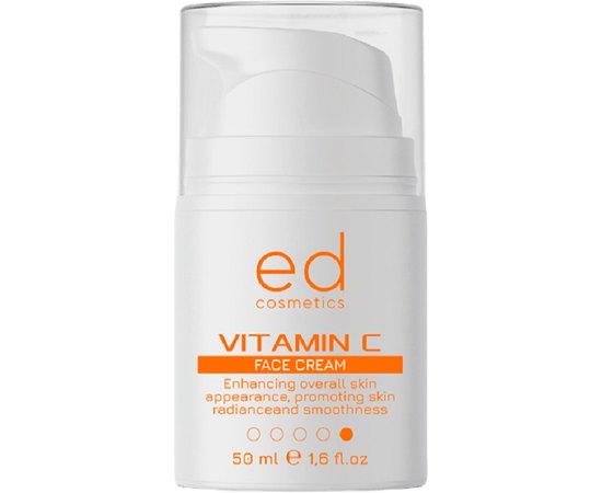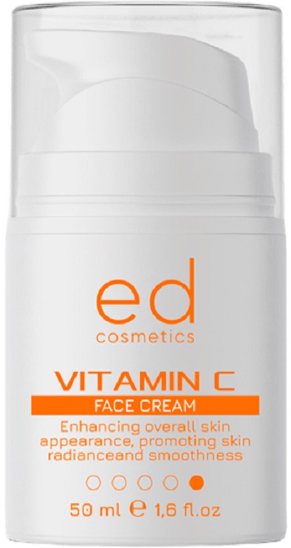 ED Cosmetics Vitamin C Face Cream, 50 ml сочетает интенсивное увлажнение с антиоксидантными свойствами витамина С. Крем поддерживает естественные процессы восстановления кожи, укрепляет ее защитный барьер и обеспечивает длительное увлажнение. Благодаря своим свойствам освещает цвет лица, выравнивает тон кожи и повышает упругость кожи. Регулярное использование крема помогает поддерживать здоровый и сияющий вид кожи, защищает ее от вредных внешних факторов, обеспечивает чувство увлажнения и освежения в течение дня.
