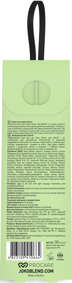 Активные компоненты Крема для рук парфюмерного Spicy Vetiver Joko Blend 30 мл: