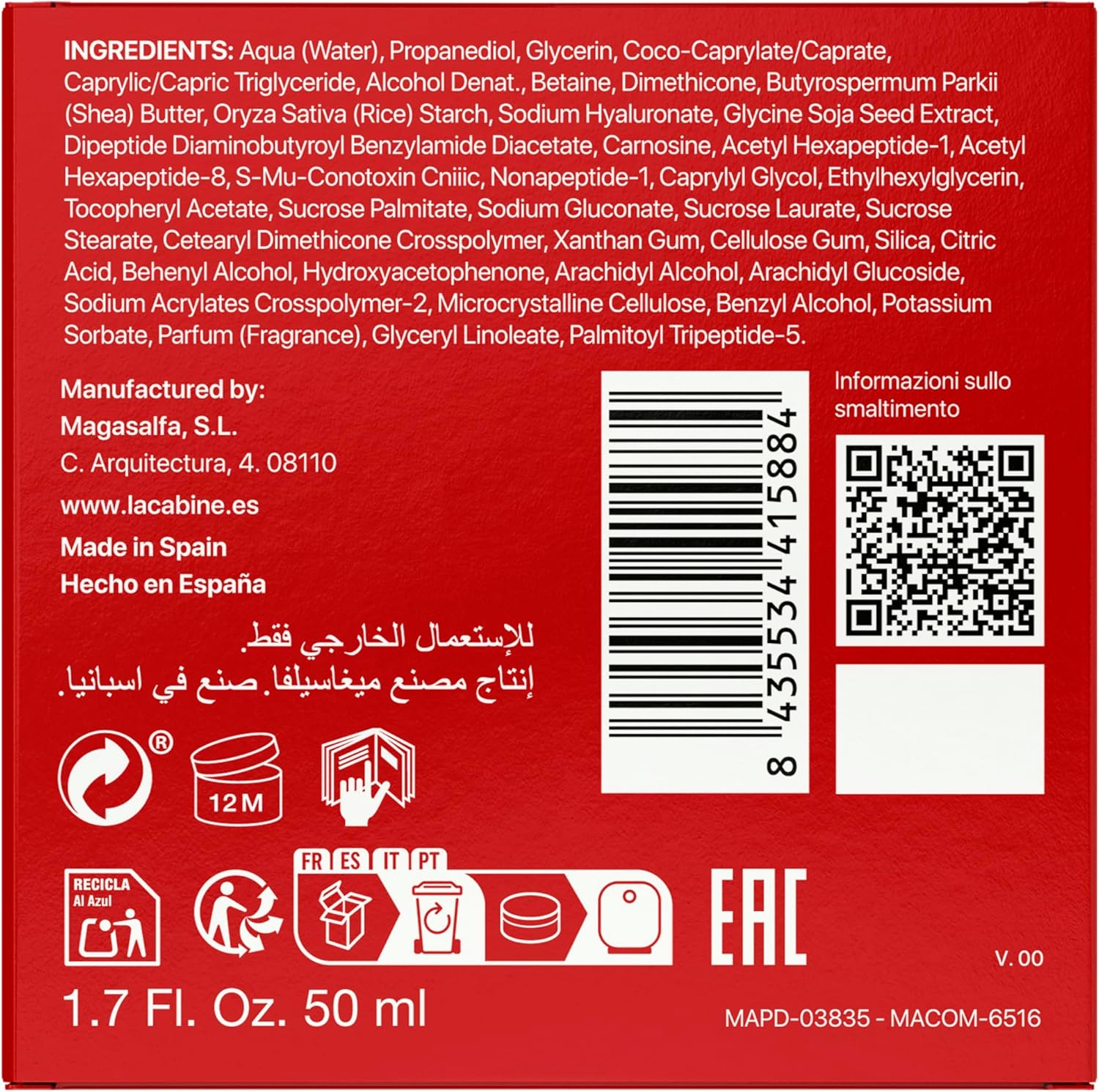 Состав: Aqua (Water), Propanediol, Glycerin, Coco-Caprylate/Caprate, Caprylic/Capric Triglyceride, Alcohol Denat., Betaine, Dimethicone, Butyrospermum Parkii (Shea) Butter, Oryza Sativa (Rice) Starch, Sodium Hyaluronate, Glycine Soja Seed Extract, Dipeptide Diaminobutyroyl Benzylamide Diacetate, Carnosine, Acetyl Hexapeptide-1, Acetyl Hexapeptide-8, S-Mu-Conotoxin Cniiic, Nonapeptide-1, Caprylyl Glycol, Ethylhexylglycerin, Tocopheryl Acetate, Sucrose Palmitate, Sodium Gluconate, Sucrose Laurate, Sucrose Stearate, Cetearyl Dimethicone Crosspolymer, Xanthan Gum, Cellulose Gum, Silica, Citric Acid, Behenyl Alcohol, Hydroxyacetophenone, Arachidyl Alcohol, Arachidyl Glucoside, Sodium Acrylates Crosspolymer-2, Microcrystalline Cellulose, Benzyl Alcohol, Potassium Sorbate, Parfum (Fragrance), Glyceryl Linoleate, Palmitoyl Tripeptide-5.