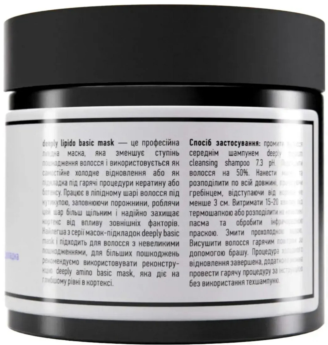 Липидная маска deeply lipido basic mask – это профессиональная маска, которая уменьшает степень повреждения волос и используется как самостоятельное холодное восстановление или как подложка под горячие процедуры кератина или ботекса. Работает в липидном слое волосы под кутикулой, заполняя полости, делая этот слой более плотным и надежно защищает кортекс от воздействия внешних факторов. Самый легкий из серии масок-подкладок deeply basic mask и подходит для волос с небольшими повреждениями, для больших повреждений рекомендуем использовать реконструкцию deeply amino basic mask, которая действует на более глубоком уровне в кортексе.