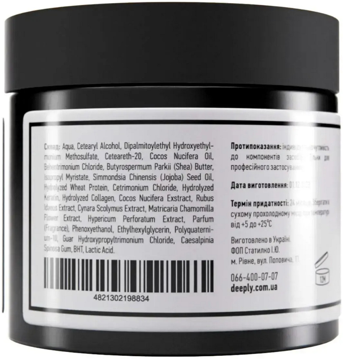 Состав: Aqua, Cetearyl Alcohol, Dipalmitoylethyl Hydroxyethylmonium Methosulfate, Ceteareth-20, Cocos Nucifera Oil, Behentrimonium Chloride, Butyrospermum Parkii (Shea) Butter, Isopropyl Myristate, Osm. Protein, Cetrimonium Chloride, Hydrolyzed Keratin, Hydrolyzed Collagen, Cocos Nucifera Extract, Rubus Idaeus Extract, Cynara Scolymus Extract, Matricaria Chamomilla Flower Extract, Hypericum Perforatum Extract, Parfum (Fragrance), Phenoxy Polyquaternium-10, Guar Hydroxypropyltrimonium Chloride, Caesalpinia Spinosa Gum, BHT, Lactic Acid.