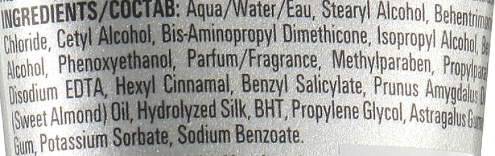 Состав: Aqua, Stearyl Alcohol, Behentrimonium Chloride, Cetyl Alcohol, Bis-Aminopropyl Dimethicone, Isopropyl Alcohol, Phenoxyethanol, Benzyl Alcohol, Parfum, Methylparaben, Propylparaben, Disodium EDTA, Hexyl Cinnamal, Benzyl Salicylate, Hydrolyzed Silk, Prunus Amygdalus Dulcis Oil, Propylene Glycol, Astragalus Gummifer Gum