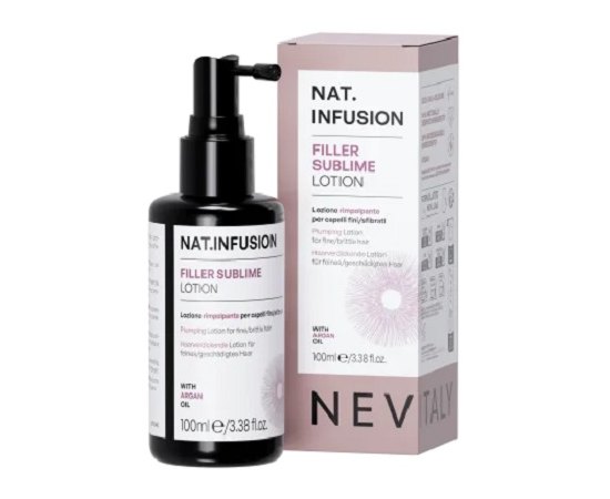 Nevitaly Filler Sublime Lotion (100 мл, pH 3.50–4.50) предназначен для деликатного, но эффективного ухода за ослабленными волосами. Легкая формула с аргановым маслом, гиалуроновой кислотой, PCA натрия, трегалозой и экстрактами мирры и зеленого чая обеспечивает интенсивное увлажнение, восстановление и антиоксидантную защиту, придавая волосам ощущение плотности и силы.