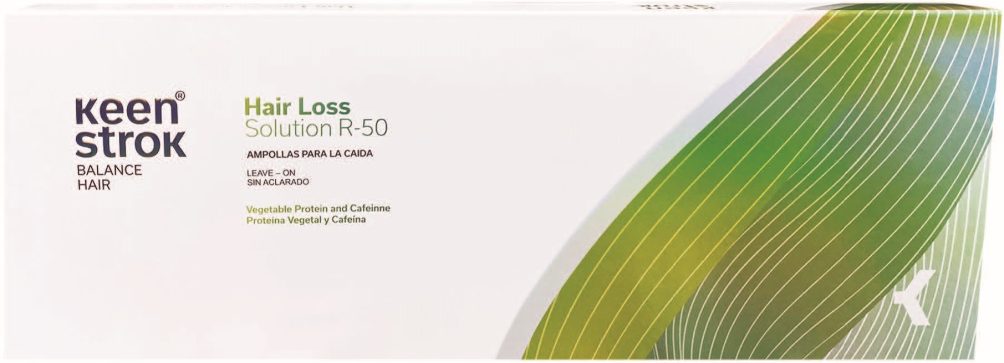 Раствор Keen Strok R-50 изготовлен из экстракта растительной плаценты, кофеина, гиалуроновой кислоты и коллагена, стимулирует пролиферацию фибробластов волос, усиливает рост волос.