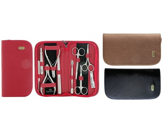 Состав набора: пилочка, двое ножниц для кутикулы, ножницы для ногтей, пинцет скошенный, двухсторонний шабер, V-образный триммер для обрезания кутикулы, книпсер, кусачки для обрезания кожи (кутикулы), кусачки для педикюра.