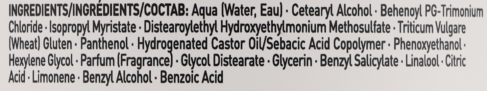Состав: Aqua (Water, Eau)· Cetearyl Alcohol· Behenoyl PG-Trimonium Chloride · Isopropyl Myristate · Distearoylethyl Hydroxyethylmonium Methosulfate · Hydrolyzed Keratin · Panthenol · Sclerocarya Birrea Seed Oil · Hexylene Glycol · Glycol Distearate · Citric Acid · Cocodimonium Hydroxypropyl Hydrolyzed Keratin · Phenoxyethanol · Potassium Sorbate · Linalool · Parfum (Fragrance) · Methylparabe