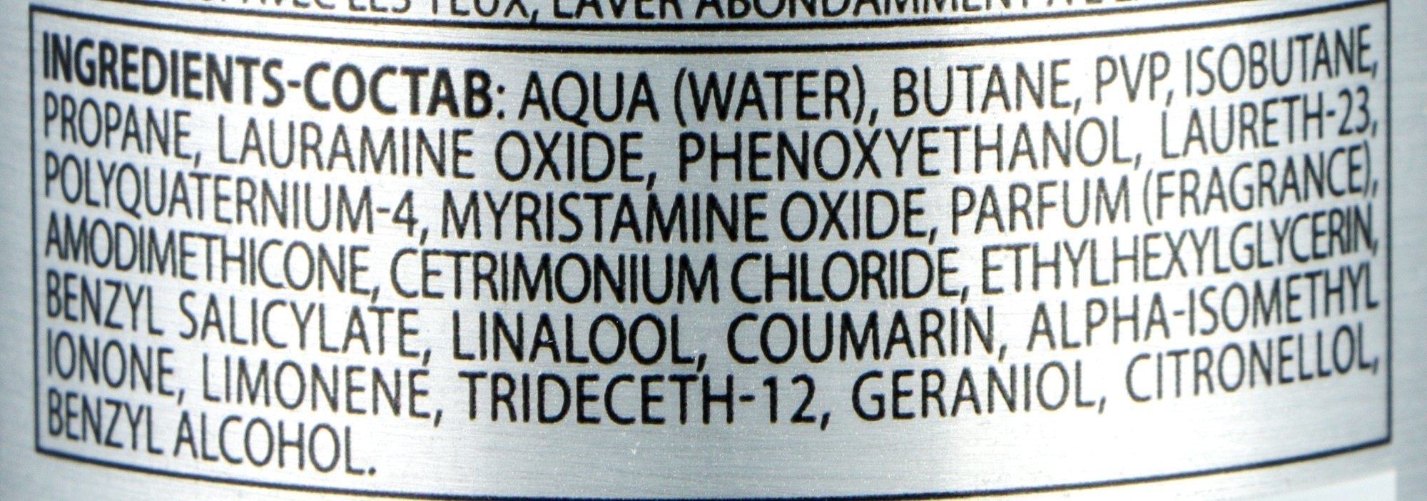 Состав: Aqua (Water), Butane, PVP, Isobutane, Propane, Lauramine Oxide, Phenoxyethanol, Laureth-23, Polyquaternium-4, Myristamine Oxide, Parfum (Fragrance), Amodimethicone, Cetrimonium Chloride, Ethylhexylglycerin, Benzyl Salicylate, Linalool, Coumarin, Alpha-Isomethyl Ionone, Limonene, Trideceth-12, Geraniol, Citronellol, Benzyl Alcohol