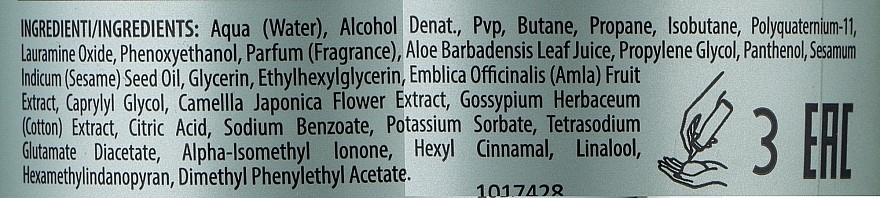Состав: Aqua (Water), Alcohol Denat., Pvp, Butane, Propane, Isobutane, Polyquaternium-11, Lauramine Oxide, Phenoxyethanol, Parfum (Fragrance), Aloe Barbadensis Leaf Juice, Propylene Glycol, Panthenol, Sesamum Indicum (Sesame) Seed Oil, Glycerin, Ethylhexylglycerin, Emblica Officinalis (Amla) Fruit Extract, Caprylyl Glycol, Camellla Japonica Flower Extract, Gossypium Herbaceum (Cotton) Extract, Citric Acid, Sodium Benzoate, Potassium Sorbate, Tetrasodium Glutamate Diacetate, Alpha-Isomethyl Ionone, Hexyl Cinnamal, Linalool, Hexamethylindanopyran, Dimethyl Phenylethyl Acetate.