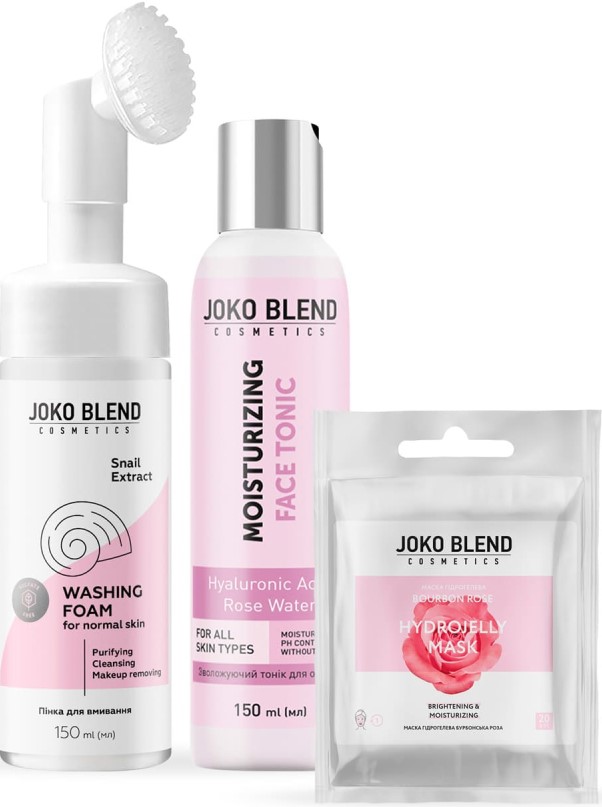 Набор для ухода за лицом Love Routine Joko Blend™ включает в себя три необходимых средства для обеспечения комплексного решения: пенка для умывания с экстрактом улитки, обеспечивающая деликатную очистку эпидермиса, увлажняющий тоник для восстановления природного pH и гидрогелевая маска Bourbon Rose для здорового вида кожи. В комплексе средства поддерживают оптимальный уровень влаги в коже, глубоко увлажняют и возвращают тонус. С каждым применением средств кожа лица приобретает более ровный тон, чувство свежести и естественного сияния. Сет упакован в минималистичный хлопковый мешочек.