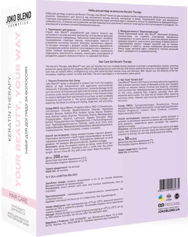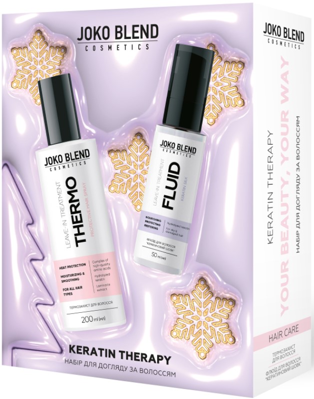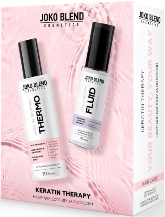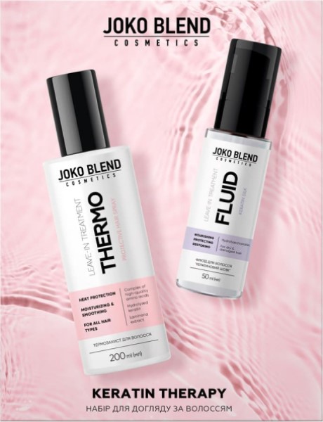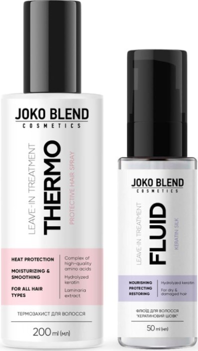 - Термозащита для волос, 200 мл. Спрей Joko Blend™ разработан для защиты волос от негативного воздействия высоких температур и агрессивных факторов окружающей среды. Обеспечивает термозащиту, предотвращает повреждение структуры локонов, препятствует ломкости и образованию секущихся кончиков. Комплекс аминокислот, кератин и экстракт ламинарии в формуле средства способствуют восстановлению поврежденных участков волос и разглаживают его поверхность, а также глубоко увлажняют и питают. Активные компоненты повышают эластичность локонов, облегчают расчесывание и укладку, дарят волосам мягкость и шелковистый блеск.