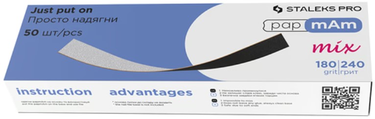Дизайн Staleks Pro papmAm Mix включает в себя двухсторонний файл с чехлом черного и белого цвета. Черный абразив предназначен для основной обработки, а белый – для финишной. Это улучшенное сочетание упрощает и ускоряет процесс опила, обеспечивая безопасность процедуры для клиента. Сменный файл легко снимается с пилы-основы, не оставляя липких следов. Благодаря полному покрытию основания исключается риск повреждения кожи.