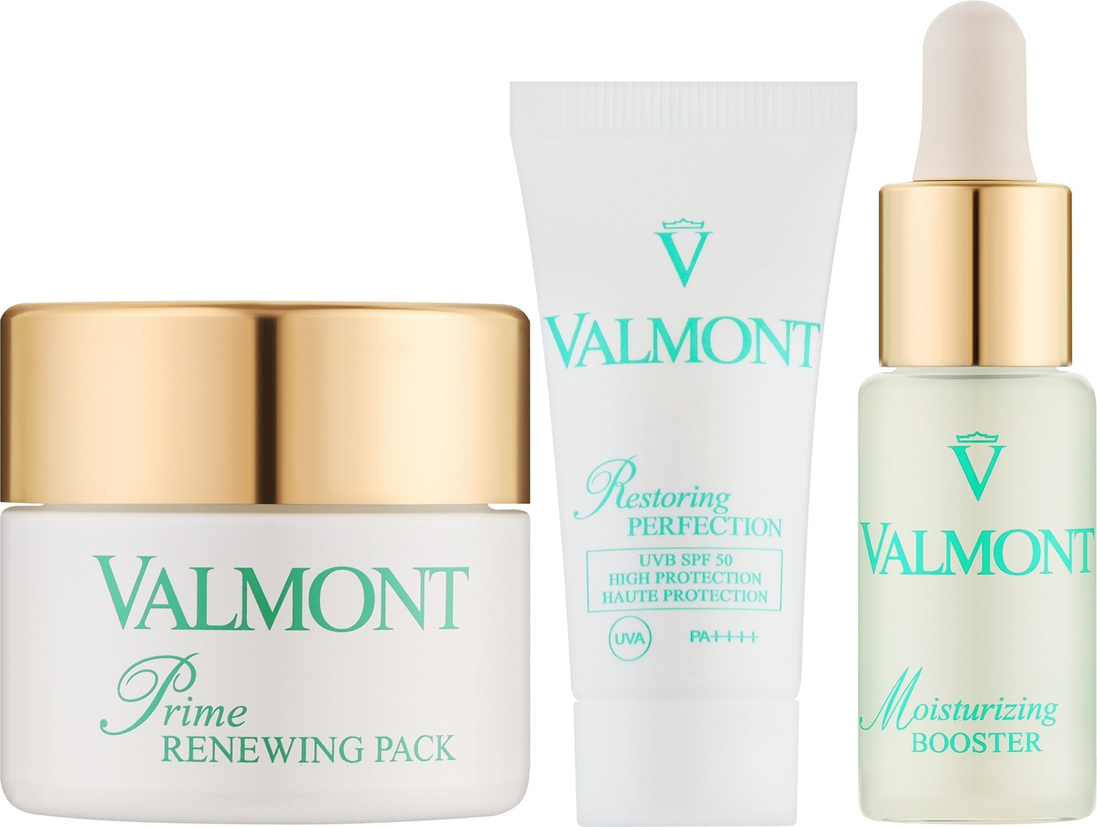 - Intensive Hydration Complex - Valmont Moisturizing Booster: Water (Aqua), Mineral Oil (Paraffinum Liquidum), Propylene Glycol, Calcium DNA, Gynostemma Pentaphyllum Extract, Lecithin, Magnesium DNA, Palmitoyl Tetrapeptide-7, Palmitoyl Tripeptide-1, Panax Ginseng Root Extract, RNA, Sodium DNA, Urea, Acrylates/C10-30 Alkyl Acrylate Crosspolymer, Butylene Glycol, C12-20 Acid PEG-8 Ester, C13-14 Isoparaffin, Caprylyl Glycol, Carbomer, Coco-Glucoside, Disodium EDTA, Glycerin, Hexylene Glycol, Laureth-7, Menthyl Lactate, Polyacrylamide, Potassium Cetyl Phosphate, Sodium Carboxymethyl Beta-Glucan, Sodium Hydroxide, Sodium Lactate, Titanium Dioxide (CI 77891), Ethylhexylglycerin, Phenoxyethanol, Fragrance (Parfum), Benzyl Benzoate, Cinnamyl Alcohol, Citronellol, Eugenol, Geraniol, Hexyl Cinnamal, Hydroxycitronellal, Limonene, Linalool.