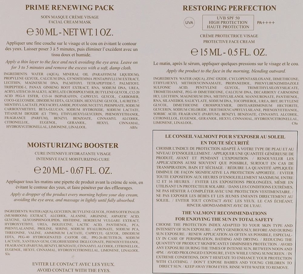 - Restorative Cream "Advantage" - Valmont Restoring Perfection SPF 50: Water (Aqua), Zinc Oxide, Cyclopentasiloxane, Dimethicone, Ethylhexyl Methoxycinnamate, Propanediol, Phenylbenzimidazole Sulfonic Acid, Pentylene Glycol, Trimethylsiloxysilicate, Tromethamine, PEG-10 Dimethicone, Calcium DNA, Decarboxy Carnosine HCL, Lecithin, Magnesium DNA, Methylsilanol Mannuronate, Panthenol, RNA, Silanediol Salicylate, Sodium DNA, Tocopherol, Urea, BHT, Butylene Glycol, Dimethicone Crosspolymer, Disteardimonium Hectorite, Glycerin, Sodium Chloride, Triethoxycaprylylsilane, Phenoxyethanol, Sorbic Acid, Fragrance (Parfum), Benzyl Benzoate, Cinnamyl Alcohol, Citronellol, Eugenol, Geraniol, Hexyl Cinnamal, Hydroxycitronellal, Limonene, Linalool.