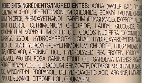 Склад: Aqua (Water, Eau), Glycerin, Dimethicone, Cetearyl Alcohol, Behentrimonium Chloride, Isoamyl Laurate, Cinnamidopropyltrimonium Chloride, Phenoxyethanol, Parfum (Fragrance), Isopropyl Alcohol, Dicetyldimonium Chloride, Cetrimonium Chloride, Lauryl Glucoside, Sodium Gluconate, Calophyllum Inophyllum Seed Oil, Cocos Nucifera (Coconut) Oil, Caprylyl Glycol, Hydroxypropyl Guar Hydroxypropyltrimonium Chloride, Guar Hydroxypropyltrimonium Chloride, Phosphatidylcholine, Citric Acid, Arginine HCl, Hydrolyzed Pea Protein, Hydrolyzed Vegetable Protein, Rosa Canina Fruit Oil, Gardenia Taitensis Flower Extract, Benzyl Alcohol, Sodium Benzoate, Potassium Sorbate, Benzoic Acid, Aminomethyl Propanol, Dehydroacetic Acid, Arginine, Limonene, Linalool, Geraniol, Citronellol, Coumarin.