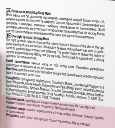 Ночная маска для губ помогает поддерживать естественный водный баланс кожи губ, даря ощущение ухоженности и комфорта.