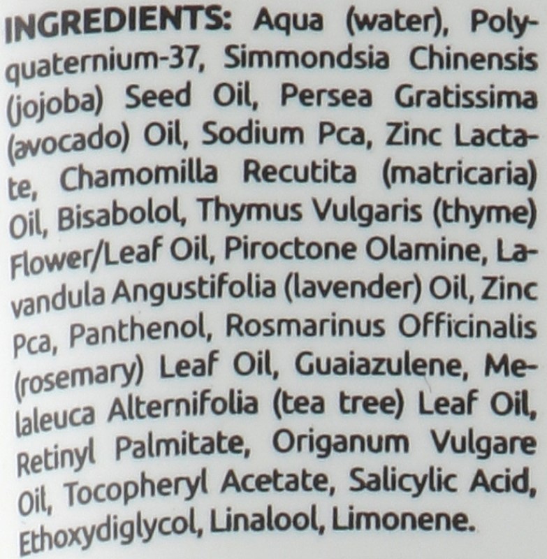 Aqua(water), Polyquaternium-37, Simmondsia Chinensis (jojoba) Seed oil, Persea Gratissima (avocado)oil, Sodium Pca, zinc Lactate, Chamomilla recutita (matricaria) oil, Bisabolol, Thymus Vulgaris (thyme) Flower/Leaf oil, Piroctone Olamine, Lavandula Angustifolia (lavender) oil, zinc Pca, Panthenol, Rosmarinus Officinalis (rosemary) leaf Oil, Guaiazulene, Melaleuca Alternifolia (tea three) Leaf oil, Retinyl Palmitate, Origanum Vulgare oil, Tocopheryl Acetate, Salicylic Acid, Ethoxydiglycol, Linalool, Limonene.