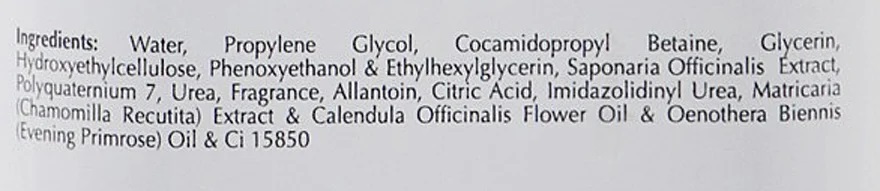 Активные компоненты: бетаин, целлюлоза, экстракт мыльнянки, алантоин, лимонная кислота, мочевина, экстракты ромашки, календулы, примулы вечерней.