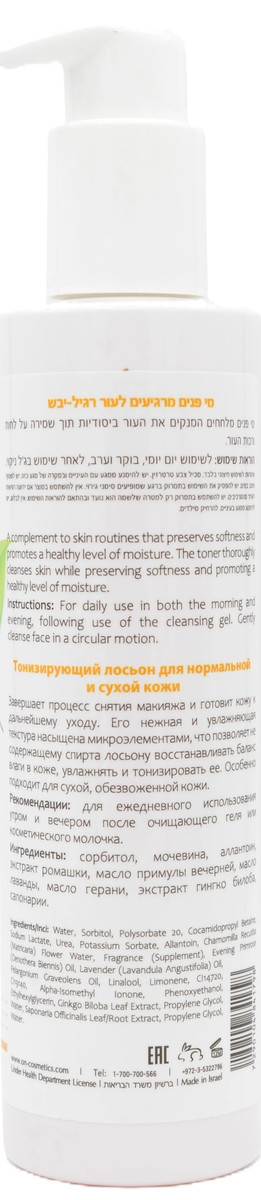 Увлажняющий легкий тоник для сухой и нормальной кожи. Служит как освещающее и тонизирующее средство, используется к конце процедуры снятия макияжа. Готовит кожу к следующим действиям по уходу (нанесение кремов или масок). Формула средства насыщена микроэлементами, поэтому средство прекрасно тонизирует кожу лица, а также восстанавливает гидробаланс. Тоник не содержит спирта, не сушит кожу и не вызывает раздражения или аллергии.