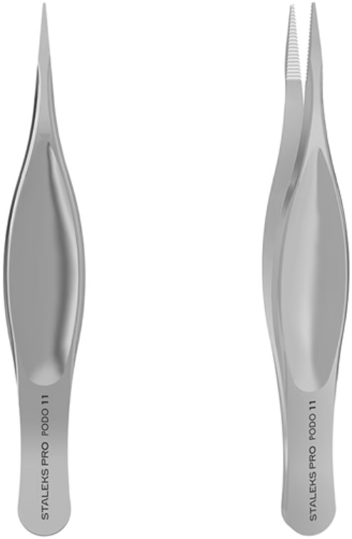 Сталекс Пинцет подологический Staleks Pro Podo 11 маленький TP-11 – специализированный инструмент полов. Создано для точного и безопасного удаления мелких частей вросшего ногтя, подногтевых мозолей, натоптышей, бородавок, ногтевой субстанции и посторонних предметов из ран и боковых валиков. Дополнительно подходит для тампонирования. Это надежный и удобный инструмент для профессионалов, очень актуальный в современной практике ухода за ногтями и стопами.