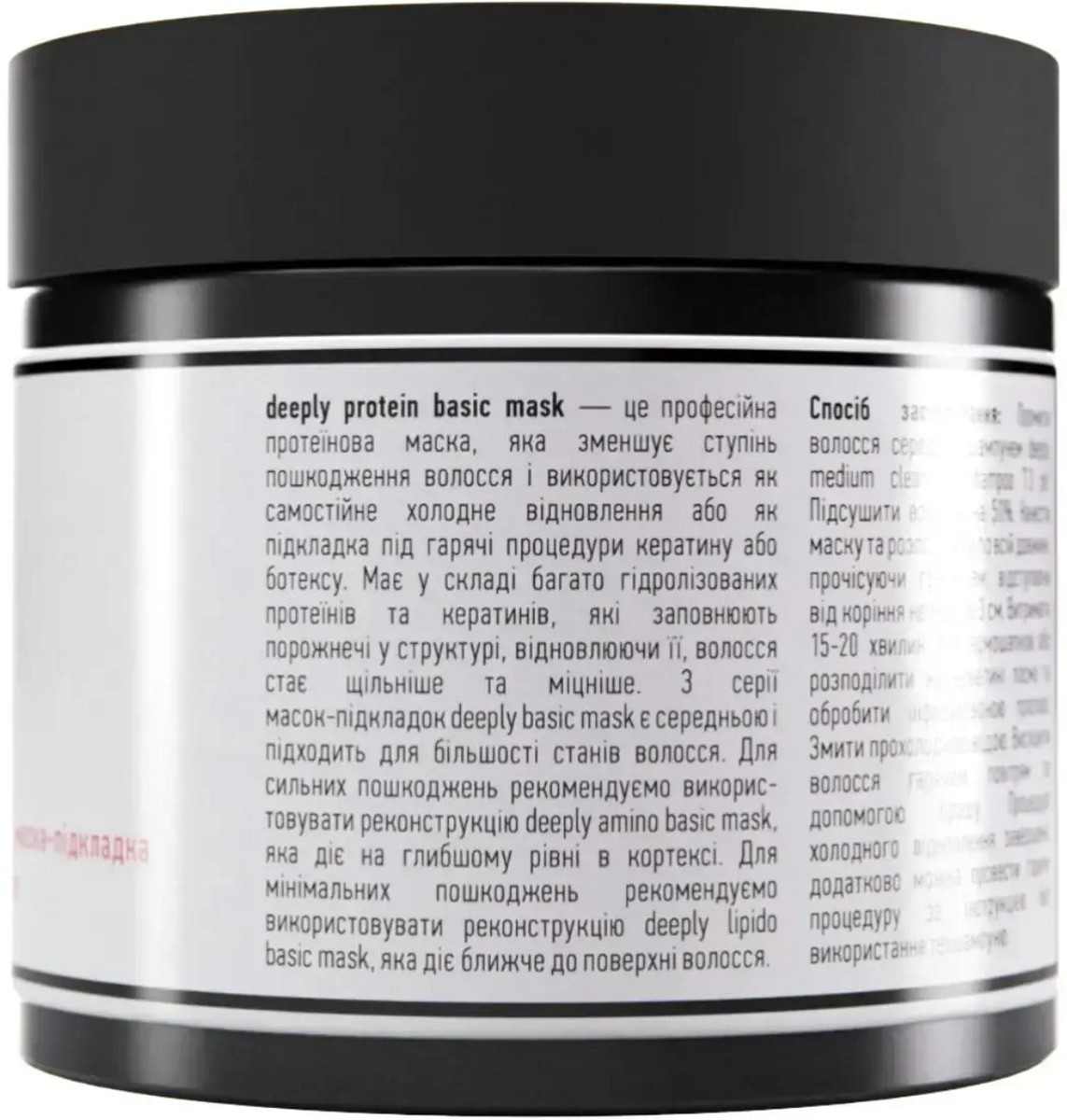Протеиновая маска-подкладка – это профессиональная маска, которая уменьшает степень повреждения волос и используется как самостоятельное холодное восстановление или как подложка под горячие процедуры кератина или ботекса. Протеиновая подложка имеет в составе много гидролизованных протеинов и кератина, которые заполняют пустоты в прядях и делают волосы более плотными и прочными. Из серии масок-подложек deeply basic mask является средней и подходит для ячеистых волос с небольшими повреждениями, для больших повреждений рекомендуем использовать реконструкцию deeply amino basic mask, которая действует на более глубоком уровне в кортексе.