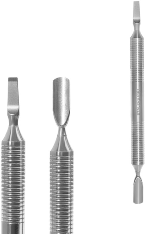 Пушер для маникюра Staleks Pro Expert 100 Type 5 разработан с учетом потребностей мастеров. Сочетает функциональные части: с одной стороны — закругленная лопатка, предназначенная для поднятия и отдвижения кутикулы, удобна в работе с ногтевыми пластинами разных форм и размеров. С другой стороны — «лопасть прямая широкая», предназначенная для поднятия грубой, крепко наросшей кутикулы. Рабочая поверхность с ручной заточкой эффективно справится с плотной кожурой, не повреждая ногтевую пластину.