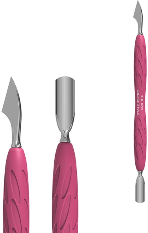 Пушер с топором Staleks Pro Uniq 10 Type 3 с силиконовой ручкой разработан для выполнения маникюра и педикюра и оснащен двумя рабочими зонами: