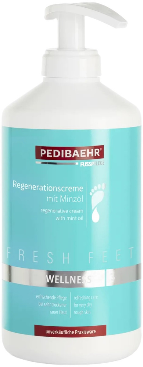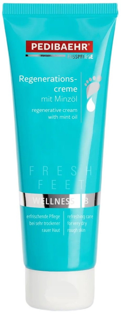 Регенерирующий крем для ног Свежая поступь PediBaehr - разработан для интенсивного питания сухой потрескавшейся кожи. Устраняет сухость, заживляет трещинки, увлажняет, придает коже гладкость, мягкость и эластичность. Целебные масла и пантенол успокаивают кожу, способствуют быстрому заживлению и регенерации трещин и ороговелостей, а витаминами А, В5, Е, F питают её. Сквалан стимулирует антиоксидантные процессы. Ценные экстракты содержат фитостерины, смолы, дубильные вещества, витамины К, С, каротин, камфору, цинеол. Эти активные компоненты восстанавливают разрушенные клеточные мембраны, ускоряют внутриклеточный обмен веществ и выработку коллагена, снимают воспаление, омолаживают кожу, делают ее гладкой и нежной. Легкая текстура крема позволяет быстро впитываться, не оставляя жирных следов.