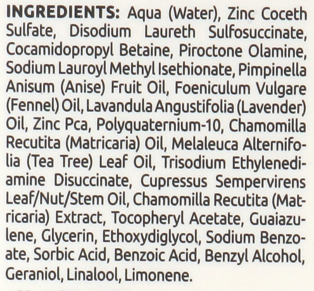 Состав: Aqua (water), Zinc Coceath Sulfate, disodium Laureth Sulfosuccinate, Cocamidopropyl Betaine, piroctone Olamine, Sodium Lauroyl Methyl Isethionate, Pimpinella Anisum (Anise) Fruit Oil, Foeniculum Vulgare (Fennel) Oil Polyquaternium-10, Chamomilla oil, Melaleuca Alternifolia (tea tree) лист оливы, Trisodium Ethylenediamine Disuccinate, Cupressus Sempervirens Leaf/Nut/Steam Oil, Chamomilla Recutita Extract, Tocoheryl Acetate, Guaiazulene Benzoic Acid, Benzyl Alcohol, Geraniol, Linalool Limonene.