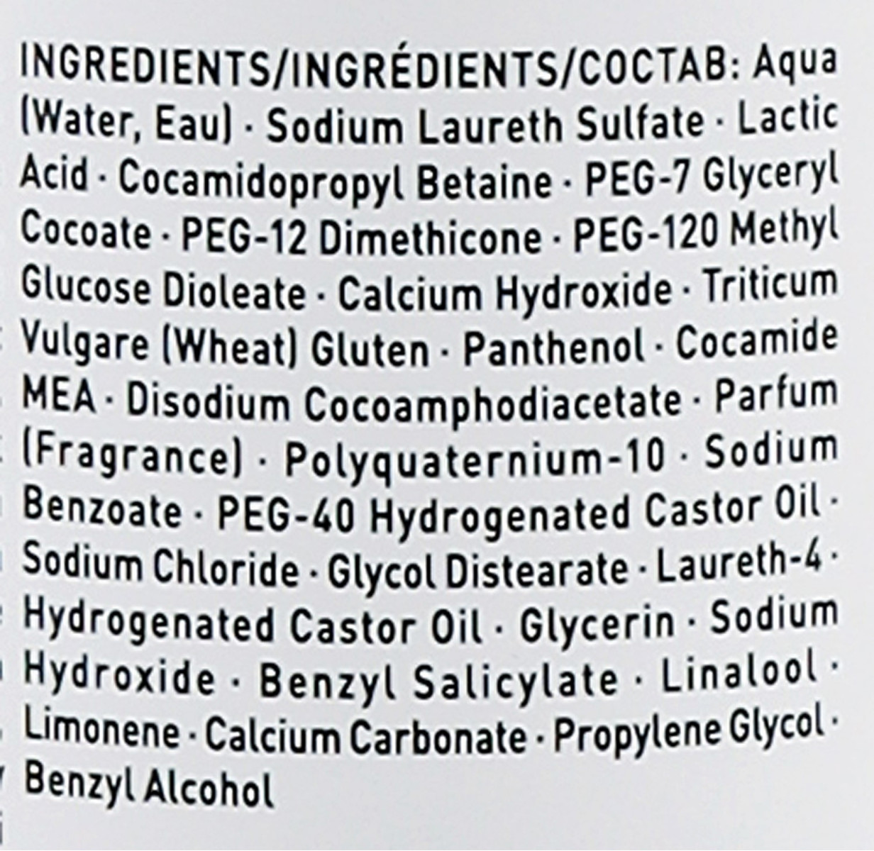 Состав: Aqua (Water, Eau) · Sodium Laureth Sulfate · Lactic Acid · Cocamidopropyl Betaine · PEG-7 Glyceryl Cocoate · PEG-120 Methyl Glucose Dioleate · PEG-12 Dimethicone · Hydrolyzed Keratin · Steardimonium Hydroxypropyl Hydrolyzed Keratin· Panthenol· Hydrolyzed Silk · Calcium Hydroxide · Calcium Carbonate · Prunus Armeniaca (Apricot) Kernel Oil · Disodium Cocoamphodiacetate · Parfum (Fragrance)· Sodium Benzoate· Sodium Chloride· Glycol Distearate · Hydrogenated Castor Oil · Sodium Hydroxide · Linalool· Benzyl Salicylate · Hexyl Cinnamal· Limonene · Citronellol· Sodium Acetate · Benzyl Alcohol· Potassium Sorbate · Methyl Benzoate · Propylene Glycol· Butylene Glycol · Phenoxyethanol · Polyquaternium-10 · Cocamide MEA · PEG-40 Hydrogenated Castor Oil · Laureth-4 · Methylparaben · Propylparaben · Mica · CI 77891 (Titanium Dioxide)· CI 17200 (Red 33)