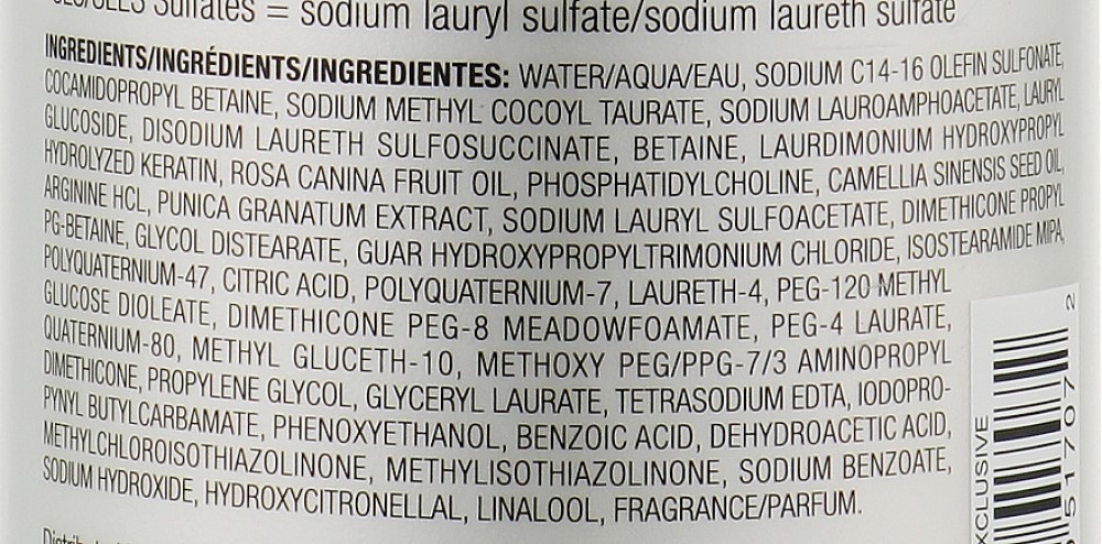 Состав: Water/Aqua/Eau, Sodium C14-16 Olefin Sulfonate Cocamidopropyl Betaine, Sodium Methyl Cocoyl Taurate, Sodium Lauroamphoacetate, Laury Glucoside, Disodium Laureth Sulfosuccinate, Betaine, Laurdimonium Hydroxypropyl Arginine Hcl, Punica Granatum Extract, Sodium Lauryl Sulfoacetate, Dimethicone Propyl Hydrolyzed Keratin, Rosa Canina Fruit Oil, Phosphatidylcholine, Camellia Sinensis Seed Ol Pg-Betaine, Glycol Distearate, Guar Hydroxypropyltrimonium Chloride, Isostearamide Mpa Polyquaternium-47, Citric Acid, Polyquaternium-7, Laureth-4, Peg-120-Methyl Glucose Dioleate, Dimethicone Peg-8 Meadowfoamate, Peg-4 Laurate, Quaternium-80, Methyl Gluceth-10, Methoxy Peg/Ppg-7/3 Aminopropyl Dimethicone, Propylene Glycol, Glyceryl Laurate, Tetrasodium Edta, Iodopro- Pinyl Butylcarbamate, Phenoxyethanol, Benzoic Acid, Dehydroacetic Acid, Methyl Chloroisothiazolinone, Methylisothiazolinone, Sodium Benzoate, Sodium Hydroxide, Hydroxycitronellal, Linalool, Fragrance/Parfum.
