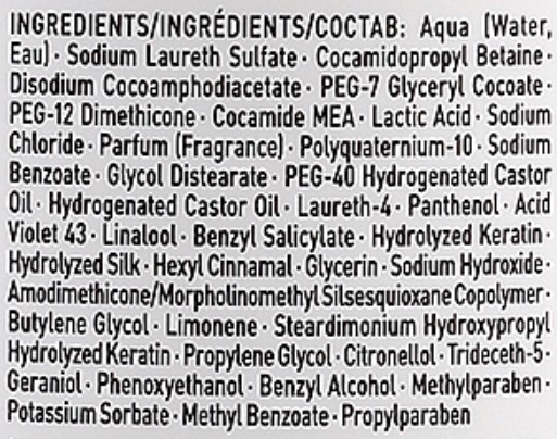 Состав: Aqua (Water, Eau) · Sodium Laureth Sulfate · Cocamidopropyl Betaine · Disodium Cocoamphodiacetate · PEG-7 Glyceryl Cocoate · PEG-12 Dimethicone · Cocamide MEA · Lactic Acid · Sodium Chloride · Parfum (Fragrance) · Polyquaternium-10 · Sodium Benzoate · Glycol Distearate · PEG-40 Hydrogenated Castor Oil · Hydrogenated Castor Oil · Laureth-4 · Panthenol · Acid Violet 43 · Linalool · Benzyl Salicylate · Hydrolyzed Keratin · Hydrolyzed Silk · Hexyl Cinnamal· Glycerin· Sodium Hydroxide · Amodimethicone/Morpholinomethyl Silsesquioxane Copolymer · Butylene Glycol · Limonene · Steardimonium Hydroxypropyl Hydrolyzed Keratin· Propylene Glycol· Citronellol· Trideceth-5 · Geraniol · Phenoxyethanol · Benzyl Alcohol · Methylparaben · Potassium Sorbate · Methyl Benzoate · Propylparaben