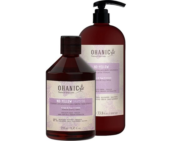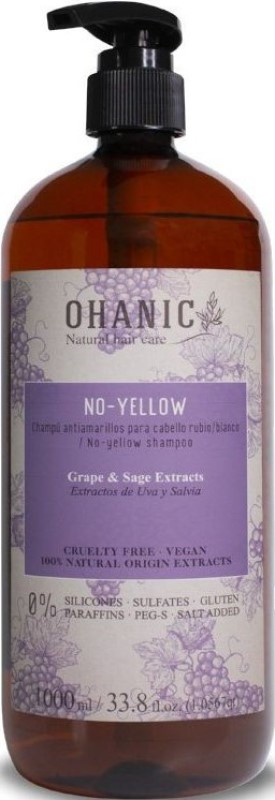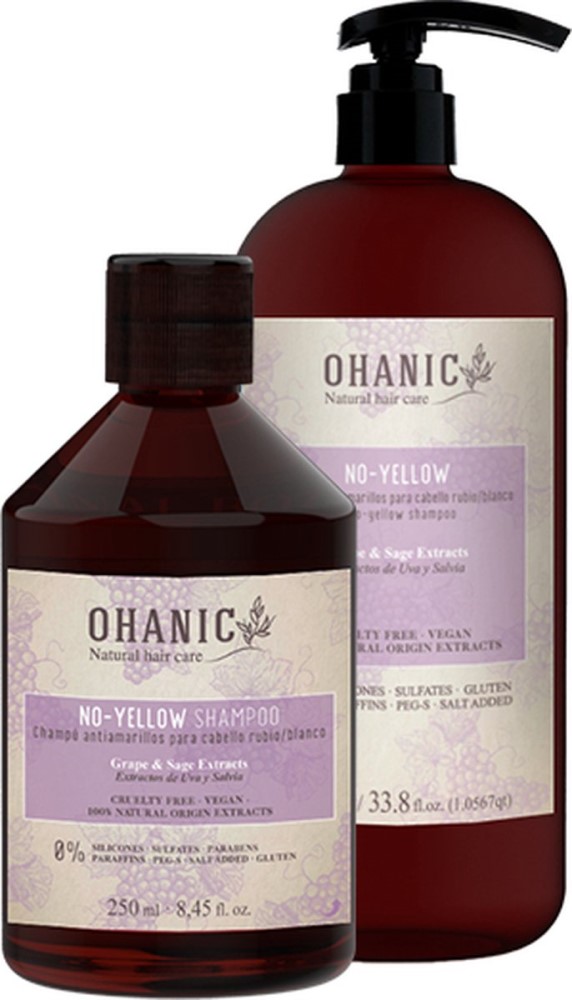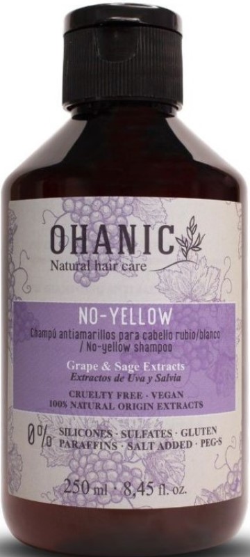 Шампунь для волос Ohanic No Yellow обогащен экстрактами винограда и шалфея, которые помогают нейтрализовать нежелательные желтые оттенки в обесцвеченных волосах.