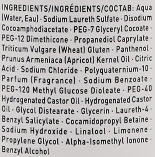 Состав: Aqua (Water, Eau), Sodium Laureth Sulfate, Disodium Cocoamphodiacetate, PEG-7 Glyceryl Cocoate, PEG-12 Dimethicone, Propanediol Caprylate, Triticum Vulgare (Wheat) Gluten, Panthenol, Prunus Armeniaca (Apricot) Kernel Oil, Citric Acid, Sodium Chloride, Polyquaternium-10, Parfum (Fragrance), Sodium Benzoate, PEG-120 Methyl Glucose Dioleate, PEG-40 Hydrogenated Castor Oil, Hydrogenated Castor Oil, Glycol Distearate, Glycerin, Laureth-4, Benzyl Salicylate, Cocamidopropyl Betaine, Sodium Hydroxide, Linalool, Limonene, Propylene Glycol, Alpha-Isomethyl Ionone, Benzyl Alcohol