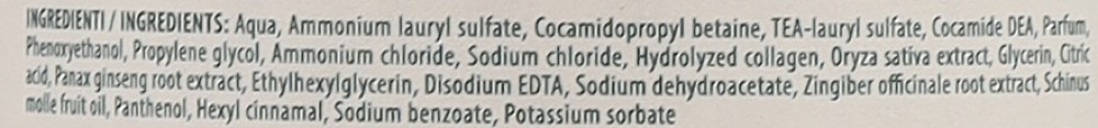 Состав: Aqua, Ammonium lauryl sulfate, Cocamidopropyl betaine, TEA-lauryl sulfate, Cocamide DEA, Parfum, Phenoxyethanol, Propylene glycol, Ammonium chloride, Sodium chloride, Hydrolyzed collagen, Glycerin, Oryza sativa extract, Citric acid, Panax ginseng root extract, Ethylhexylglycerin, Disodium EDTA, Sodium dehydroacetate, Zingiber officinale root extract, Schinus molle fruit oil, Panthenol, Hexyl cinnamal, Sodium benzoate, Potassium sorbate, Glycine, Larix europaea wood extract, Sodium metabisulfite, Camellia sinensis leaf extract, Zinc chloride.