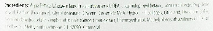 Состав: Aqua, Sodium laureth sulfate, Cocamide DEA, Cocamidopropyl betaine, Sodium chloride, Propylene glycol, Parfum, Glycol distearate, Glycerin, Cocamide MEA, Hydrolyzed collagen, Citric acid, Disodium EDTA, Sodium dehydroacetate, Zingiber officinale root extract, Magnesium nitrate, Phenoxyethanol, Magnesium chloride, Methylchloroisothiazolinone, CI 19140, Methylisothiazolinone, C.I. 42090