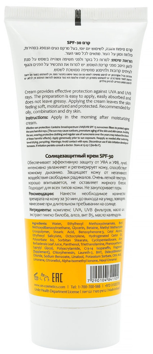 Солнцезащитный крем без тона OnMacabim PR Sunblock Cream SPF 30, 100 ml