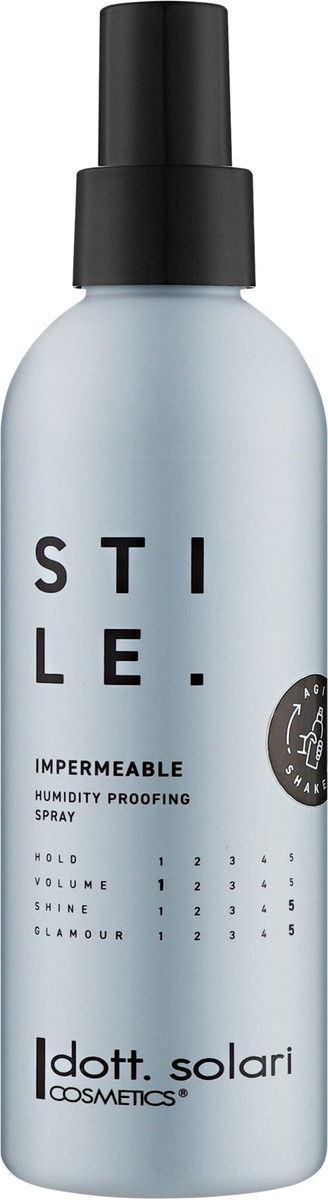 Dott. Solari Impermeable – Humidity proofing spray – спрей для защиты от влаги Отталкивает влагу и обеспечивает длительную защиту от пушистости. Обволакивает каждую прядь, создавая водонепроницаемый барьер. Придает волосам мягкость и шелковистость, не жирнит и не отягощает их.