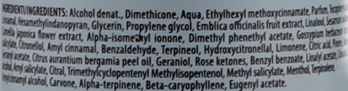 Состав: Alcohol denat., Dimethicone, Aqua, Parfum, Bis-ethylhexyloxyphenol methoxyphenyl triazine, Tocopheryl acetate, Hexyl cinnamal, Hexamethylindanopyran, Glycerin, Propylene glycol, Emblica officinalis fruit extract, Linalool, Sesamum indicum seed oil, Alpha-isomethyl ionone, Camellia sinensis leaf extract, Dimethyl phenethyl acetate, Gossypium herbaceum extract, Benzyl salicylate, Citronellol, Amyl cinnamal, Benzaldehyde, Terpineol, Hydroxycitronellal, Citric acid