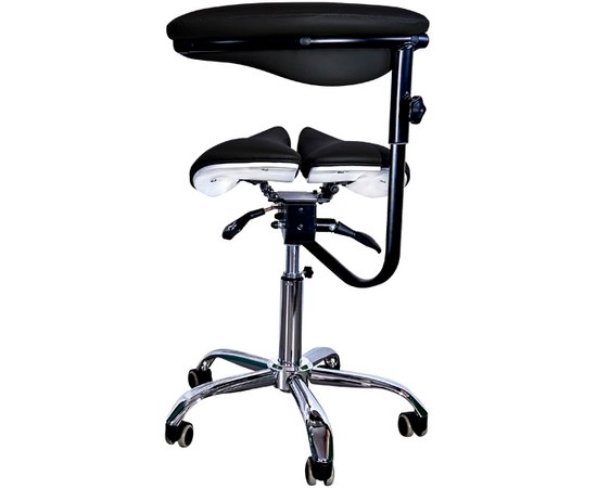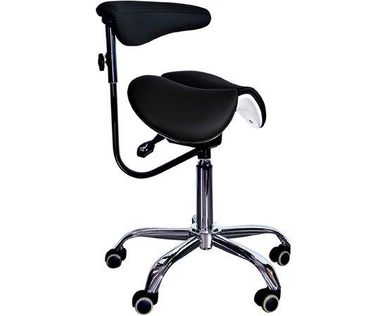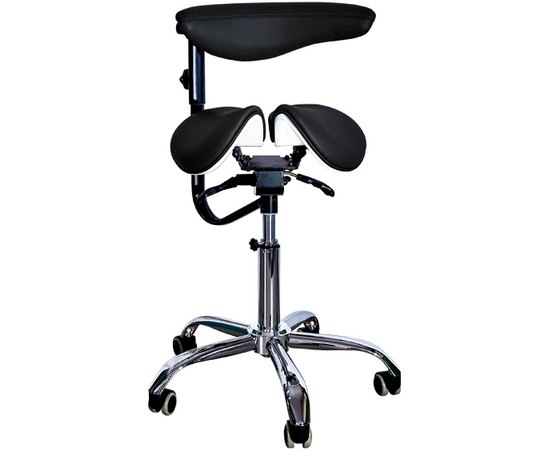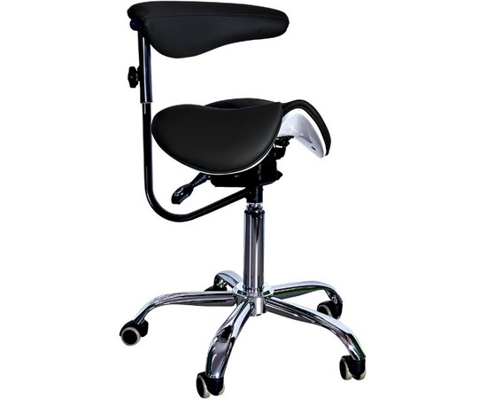 Эргономичный стул-седло для мастера модель 8016-2 черного цвета с разделенным сидением и удобной спинкой имеет 4 механизма регулировки для изменения высоты стула и высоты спинки стульчика, а также для изменения угла наклона и угла наклона спинки. Стульчик комплектуется фиксатором высоты. Спинка вращается вокруг оси, может служить подлокотником. Возможно использование сиденья в 2-х положениях – с фиксированными или балансирующими подвижными частями. При сидении на стульчике-седле минимизируется на зону копчика, поскольку основной опорой являются кости таза. Удобная эргономичная спинка способствует поддержанию поясничного корсета и фиксирует положение на стуле.