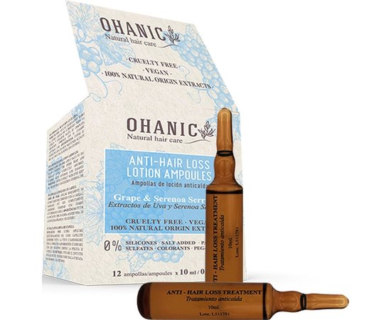 Ohanic Anti-Hair Loss Lotion Ampoule — ампули з лосьйоном проти випадання волосся. Лосьйон має антисептичну дію, живить волосяні фолікули, зміцнює їх, стимулює ріст нового волосся, тонізує та захищає шкіру.