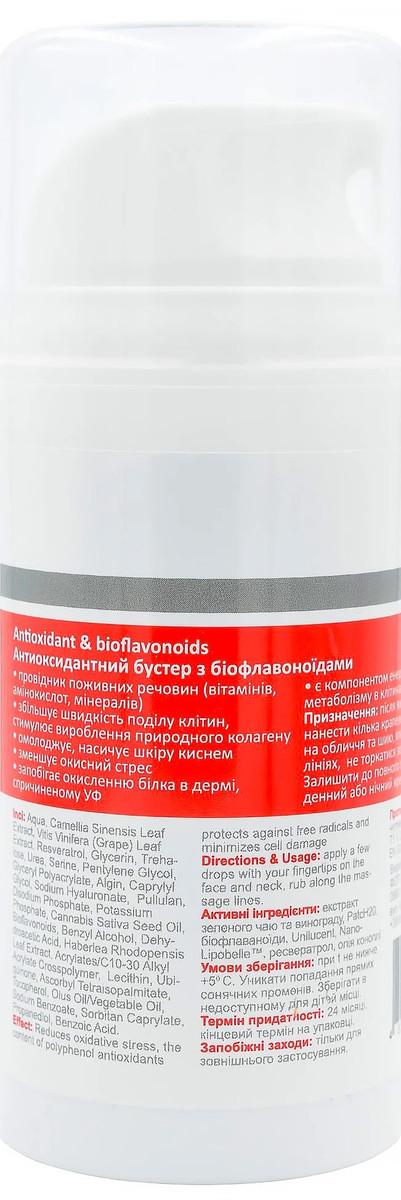 Активні інгредієнти: екстракт зеленого чаю та винограду, PatcН20, біофлаваноїди, Unilucent HR-14, Nano-Lipobelle ™ DN CoQ10 oA, ресвератрол, олія коноплі.